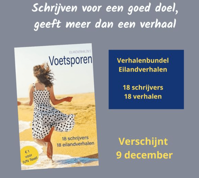 Op 9 december 2023 wordt de verhalenbundel Voetsporen – 18 schrijvers, 18 eilandverhalen gelanceerd. Het is het vijfde deel van de serie Eilandverhalen, die allemaal de Wadden als thema hebben. Van elk verkocht boek wordt 1 euro gedoneerd aan een goed doel en bij deze bundel is dat de IVN Texel. Die gaat de donaties gebruiken voor het opzetten van activiteiten voor kinderen (en hun ouders) op het gebied van natuurbehoud door natuurlijk samen te leren kijken.