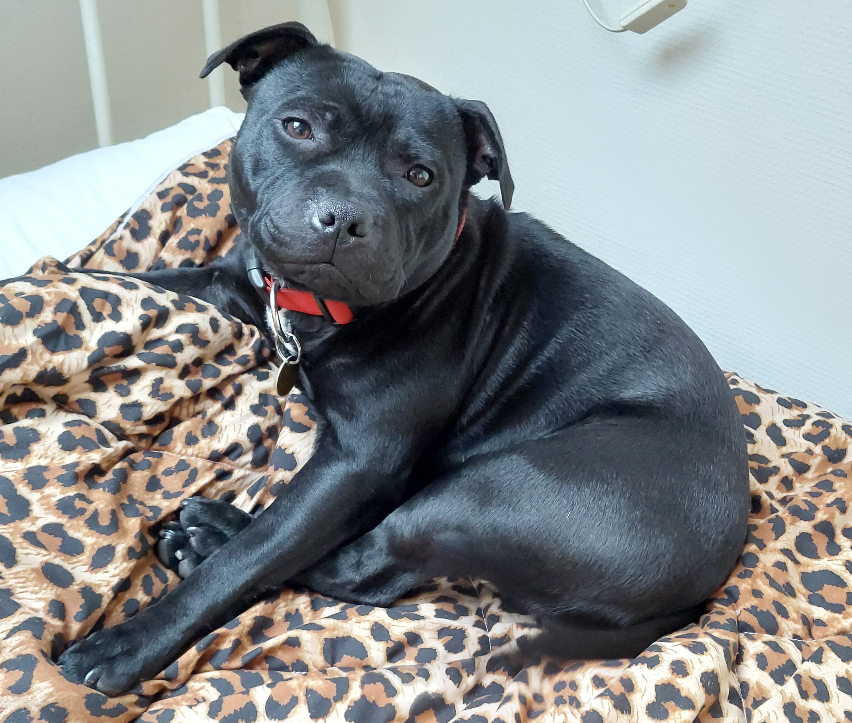 Het enige is dat ze nog wel heel onstuimig is. Ze was laatst weggelopen, zomaar. Het vrouwtje was wel erg geschrokken want het was donker en ze liep echt gewoon de hoek om. Hij denkt niet dat ze nu nog ooit een keer los mee mag. Het vrouwtje heeft in ieder geval een nieuw tuigje voor haar gekocht. Een geel tuigje, wel weer heel opvallend. Gelukkig krijgt hij altijd gewoon mannelijke kleuren. Maar het staat haar leuk, dat dan weer wel.