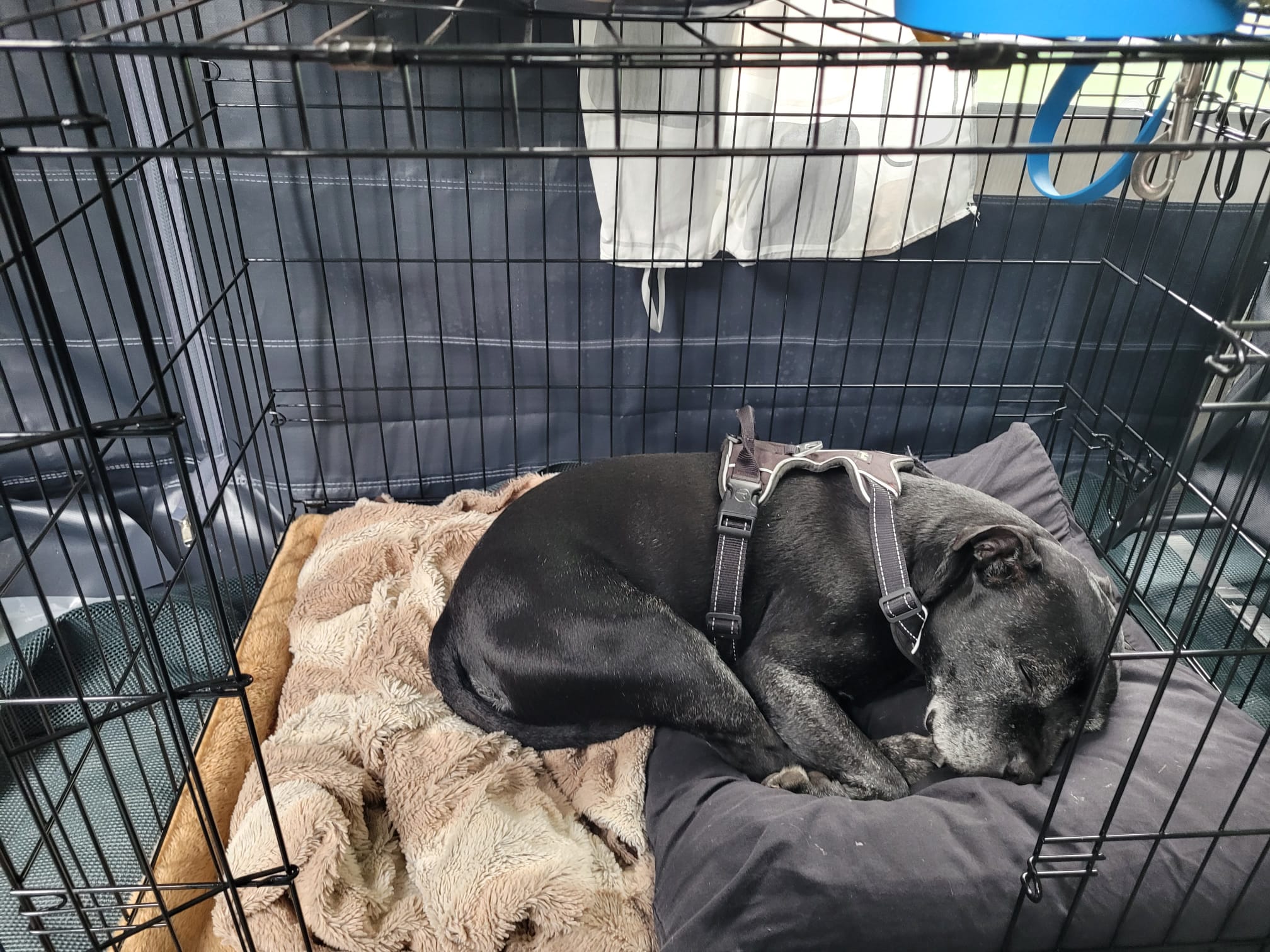 Het was gezellig. Maar het was ook wel weer vermoeiend. Zes mensen en een klein hondenmeisje in de gaten houden, poeh. Het was een hele roedel. En normaal mag hij niet in de bench, omdat die van Kaatje is, maar nu mocht hij er toch wel een tukje doen. Gelukkig maar, het was soms echt nodig.